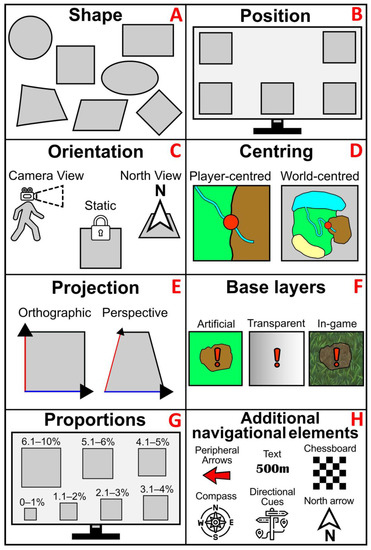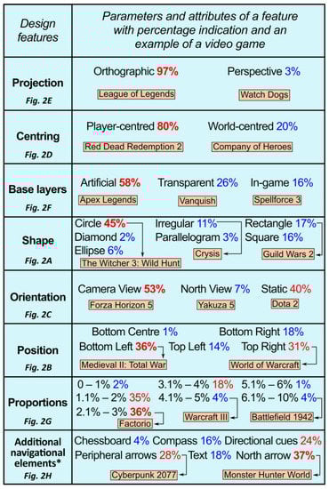 Parameters and attributes for 8 mini-map features according to the chosen 100 video games ((A) shape, (B) position, (C) orientation, (D) centring, (E) projection, (F) base layers, (G) proportions, (H) additional navigational elements).