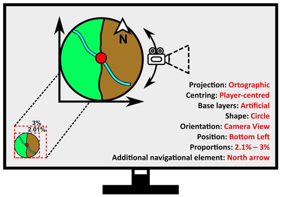 The proportions of the individual interface elements on the displayed screen is another important design feature of the UI (user interface), which directly affects the appearance and readability of the game during play. The proportions of the individual elements are understood as the percentage of the area they occupy in relation to the total available screen [58]. The appropriate size of the cartographic element of the mini-map is extremely important, as too small an element size may result in insufficient visibility of the elements displayed on it, making it only a decorative element of the user interface. On the other hand, a mini-map that is too large may obscure other important elements of the video game’s graphic design that may prove important during gameplay. As suggested by game designers, mini-maps should generally not exceed 10% of the available viewing area [50].