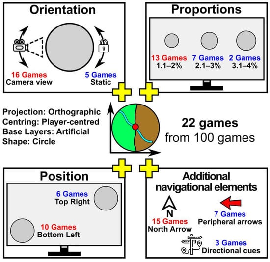 The unexpected fact of the research that all eight parameters are fulfilled with the highest percentages by only one game gives rise to a discussion about the complementarity and holistic nature of the design process in the context of the analysis of mini-map features [80]. Therefore, the authors draw attention to the possibility of grouping several selected features instead of treating all eight features of the mini-map together. Based on the comparison in Figure 3, four design features can be identified that have clearly defined priority parameters. Figure 5 shows the four most preferred parameters, which 22 out of 100 games fulfil: projection (orthographic), centring (player-centred), base layers (artificial) and shape (circle). The four features with the addition of camera view orientation implement mini-maps from 16 games, while the addition of the north arrow implements 15 selected video games. For the position feature, an unchanged trend of slightly more mini-maps in the lower left corner of the screen was noted (10 games). However, when identifying the four priority features, the proportion of smaller mini-maps is surprisingly much larger (13 games 1.1–2%).