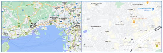 Maps of Kobe at different scales from Google Maps, showing the differences that cause the desert fog effect.