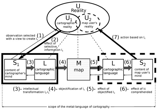 There is a vast amount of research on the definition of cartography as a communication process [9,10,11,12,13,14], and we do not aim to revisit all these models in this paper. The model from Kolacny can be seen as a linear communication process. However, with pan-scalar maps, the process has become more of a communication loop, where the cartographic language constantly updates based on interactions stemming from the user’s mind. To summarise, pan-scalar map disorientation is less likely when both the cartographer and the map user are highly skilled in cartographic literacy. Unfortunately, it is likely rare that this is the case.