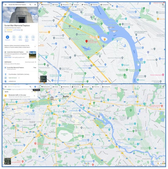 Zoomed-in view of the Berlin memorial of the Soviet War on top and a view at a smaller scale, where the Y-shaped river section can be used to find the memorial (source: Google).