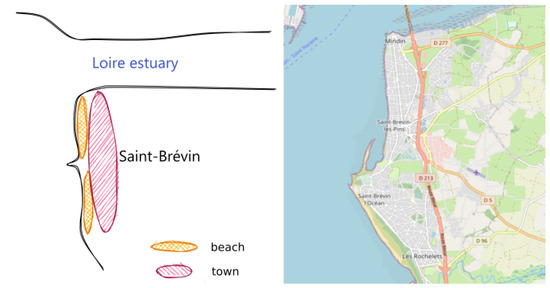 Illustration of the spatial distortion effect with a mental representation of Saint-Brévin, France on the left and the corresponding map extract on the right (©OpenStreetMap contributors).