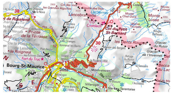 The situation in () is interesting because it shows how several pan-scalar anchors with a good spatial distribution could help to easily grasp the approximate scale of the map view. Here, the only anchors used during zooming were the town of Bourg-St-Maurice and the road in the valley that crossed the town. Another anchor, such as a prominent summit close to the border, would have helped the protagonist to understand that the large pink line really was the border because it was close to the summit.