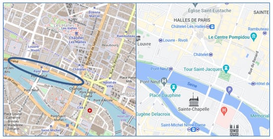 - The lack of landmarks in the map view can also cause a failed reconciliation, even though one has a mental representation of the map view. This can be due to a cluttered map view [45], for instance, or by design choices (e.g., a person use the subway stations in his or her mental representation of Paris, and they do not appear on the map). The situation in () also shows that landmarks can be there but are deceptive (lack of updates, for instance).