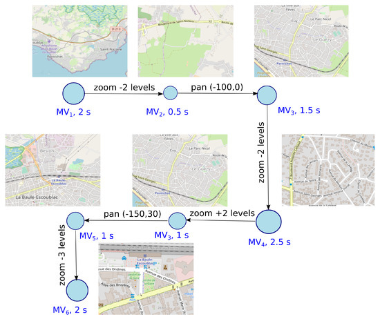 Figure 7 illustrates how the exploration can be deconstructed into several steps using this definition. In this example, the user is searching for the train station of La Baule in France. Starting with a small-scale view of the coastal town and its surroundings, the user searched for the railroad and zoomed in before quickly panning, as the zoom was imprecise and not centred on the railroad. Then, seeing a train station, the user zoomed in once again but realised that this new view () did not show the correct train station. After a zoom out and a pan, the user zoomed in again on a train station, and the visualisation of confirmed that this was where the train station was. During this dynamic exploration, there were multiple times when the user could experience disorientation, and we can see that it is not only a single map view that users try to localise but a complete path.