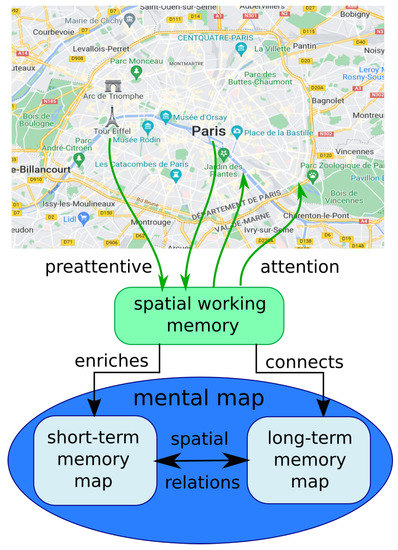 In this model, we differentiate the three types of memory: working memory, short-term memory and long-term memory [26]. The working memory, and more precisely the spatial working memory, is the brain component that processes the spatial information that we see and reconciles the information with our mental representation. This mental representation can use short-term memory, the part of the memory that is easily accessible but suffers from limited storage capacities and decays over time [27,28]. This is where we store the large river that we saw in our previous map view before zooming. Obviously, the mental representation is also mainly stored in the long-term memory, which knows that Paris is the capital of France and contains the famous Eiffel Tower (Figure 8). The more we remember the past views of the map and connect them to our long-term memory mental map, the better we reconcile the current view. This is why it is important to study how memorable a map is [29,30,31]. Mental maps and representations are much more complex than physical maps; they are a cognitive collage [32] or a cognitive multi-scale atlas [33] (i.e., a set of fragments of mental maps) at different scales and locations connected with topological (mainly) and metrical (sometimes) spatial relations.