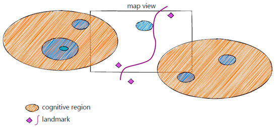 - The cognitive regions, landmarks, anchors, cognitive images, geographical concepts, etc. our mental representation is built on are mentally dependent on the scale [18,19,57]. This is what can be called the persistence of an element [19]. When one reconciles the map with his or her mental representation, one somehow guesses the scale of the map while connecting its landmarks and cognitive regions to the ones of his or her mental map that are also related to a scale. The situation in () shows that when one’s guess of the scale is wrong, the reconciliation can fail.