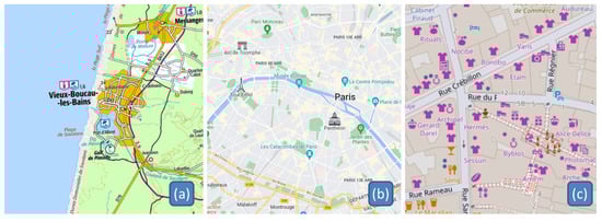 Three examples illustrating the pre-attentive mode of reconciliation. (a) The sea is a clear Gestalt element that enables a pre-attentive reconciliation (source: IGN). (b) Some touristic venues of Paris are highlighted with symbols that are very salient compared with the map background (source: Google Maps). (c) This cluttered map limits any pre-attentive reconciliation due to the amount of rendered information (source: OpenStreetMap contributors).