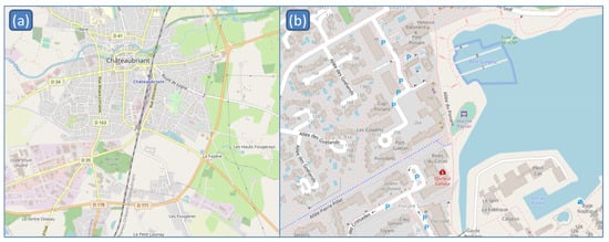 Figure 11. Two examples where a failed anticipation might occur. (a) The Gestalt principle of closure anticipates a ring road around the town of Chateaubriant, France, whereas it only covers three fourth of the extent. (b) The water surface in the coastal town of La Grande Motte, France seems to be the Mediterranean Sea, but it is a lake, and the sea shore is just south of this place (©OpenStreetMap contributors). - The contrary might also bring awareness of being lost (i.e., the presence of a known landmark that should not be there). This is quite common when zooming in heavily on a map (e.g., if one wants to zoom in on New York, and Boston appears after the zoom, then one knows that he or she is not where he or she is supposed to be and zooms back out).