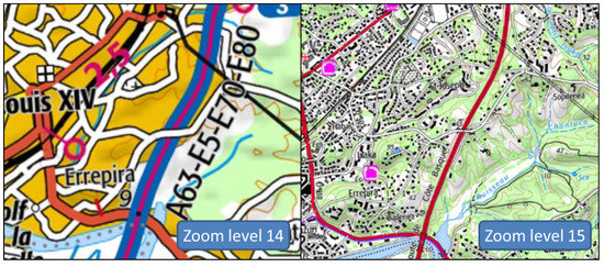 Two consecutive scales at zoom levels 14 and 15 where the map changes a lot, preventing pre-attentive reconciliation based on common landmarks (source: IGN).