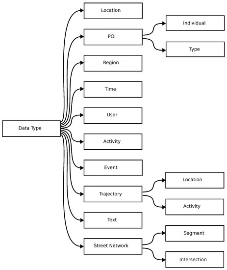 A large proportion of all data has a geographical or spatial element. In fact, some authors argue that this proportion is 80% or more [33]. To help structure the types of representations learnt, we designed a taxonomy of the geographical data types most commonly considered in the works reviewed in this study. This is displayed in Figure 2. Other authors have previously proposed taxonomies of geographical data types. However, we found that these mostly contained classical geographical data types and did not capture many of the data types encountered in our study. For example, the taxonomy proposed by Scheider et al. [34] does not contain the data types of user or text. These specific data types were frequently encountered in our study.