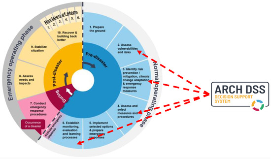 Various ARCH tools have been provided to perform these activities, in particular, the ARCH DSS addresses the activities indicated in steps 2, 3, 4 and 6 of the pre-disaster phases.
