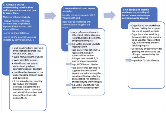 As a matter of fact, the lack or paucity of co-creation practices in the field of risk and impact scenario assessment has certainly contributed to the fact that tools created so far have not been taken up or have been adopted to a very limited extent by stakeholders and/or public administration. Figure 3 provides a schematic representation of the co-created impact and risk assessment process that was originally defined as part of the ARCH project.