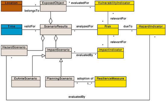 Data model represented as a UML class diagram. The yellow color highlights the risk/resilience variables and definitions that are used to evaluate the scenarios (how). The Scenario-Results entity is a container for the Hazard-Scenario values, Exposure/Vulnerability values and the computed Impacts (what). Location refers to the geographic place of the objects exposed at risk (where) and Time to the time periods of reference for the scenarios (when), * stands for multiplicity.