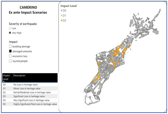 Figure A1 and Figure A2 present the ex-post scenarios after the implementation of solutions and strategies selected from the ARCH RMI. In particular, Figure A1 shows the positive effects of realizing a light structural intervention on buildings to reduce the seismic vulnerability; the difference in terms of impacts (economic losses in particular can be seen in the picture) with respect to status-quo (or as built) conditions can be appreciated.