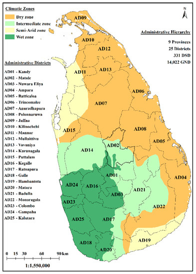 Study area indicating climatic zones, district boundaries, and administrative divisions of Sri Lanka.