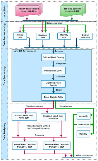 Datasets collected from the ISS from 2018 to 2021 were used to generate district-wise and island-wise lightning flash density considering annual, seasonal (monsoonal), and monthly data. Seasonal and monthly patterns from 1998 to 2014 were identified using TRMM data and flash density raster maps were generated considering district and island-wise. A clear descriptive summary of the methodology followed is shown in Figure 2. Equation (6) has been used to calculate the average flash densities from 2018 to 2021 and Equation (7) has been utilized to calculate the average flash densities from 1998 to 2014. Both datasets were associated with 0.20 × 0.20 latitude and longitude grids to correspond with the previous studies [19]. According to [31,32], LIS-on-TRMM and LIS-on-ISS collection of data for different locations have varying view times between 0 to 80 s and 0 to 90 s respectively. In order to determine the maximum threat level due to lightning over the country, the highest values from the range (80 s and 90 s) were taken as the view times to calculate the lightning flash density, as shown in Equations (6) and (7).