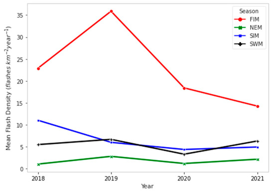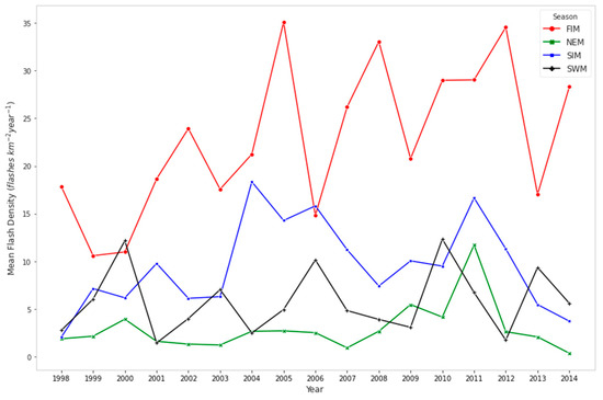 FIM, which is in March and April, had recorded the highest number of flashes compared to other monsoon seasons. The highest flash density observed during the FIM was in 2005, with a value of 35.09 flashes km−2 year−1. Overall, the lowest flash densities were observed during the northeast monsoon season, with the lowest average flash density being 0.36 flashes km−2 year−1 in 2014. Compared to other seasons, FIM was most significant between 2006 and 2014, with values ranging between 15.00 and 35.00 flashes km−2 year−1. The peak of SIM occurred in 2004 and since then it has been gradually decreasing, with a sudden spike in 2011. SWM demonstrated a constant flow with a peak intensity that did not exceed 15.00 km−2 year−1. NEM, on the other hand, was low until 2007, then showed an increase until 2011, followed by a decline.