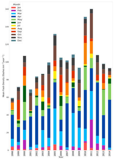 According to Figure 4, it can be clearly seen that over the period from 1998 to 2014, the highest number of flashes occurred during April, and that 2012 recorded the highest value of 60.45 flashes km−2 year−1 for this month, followed by 54.38 flashes km−2 year−1 in 2014. After April, the most frequent lightning occurred in October and March. Overall, July was the month with the lowest number of flashes. A considerable number of months with a lightning density of above 10.00 flashes km−2 year−1 occurred in the years 2000 and 2011. It is noteworthy that there was a significant level of lightning between February and May 2011. The mean flash densities in December were negligible during 2011, whereas in 2009 it was as high as 13.41 flashes km−2 year−1.