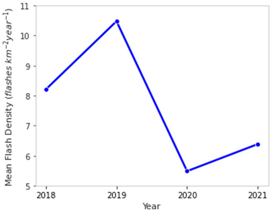 Average lightning flash densities obtained from 2018 to 2021 are shown in Figure 5. The data for 2018 and 2019 displayed an increasing trend in lightning densities compared to 2020 and 2021, registering 8.21 flashes km−2 year−1 and 10.48 flashes km−2 year−1 respectively. The lowest value was observed in 2020 at 5.48 flashes km−2 year−1. The steep decrement from 2019 to 2020 may be because of the climatological changes that occurred due to the travel restrictions that were imposed during the COVID pandemic situation in the country.