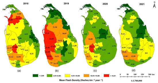 (a–d) represent district-level annual variation of lightning flash densities in 2018, 2019, 2020, and 2021 respectively.