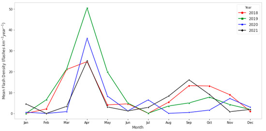 April had recorded the highest flash densities in all four years, wherein the highest value of 50.47 flashes km−2 year−1 had been recorded in 2019. The second-highest peaks were visible in September, as shown in Figure 7. Flash density values during August, September, and October 2020 were significantly less compared to other years. While looking at the years 2018–2021, the year 2019 stood out as having the most lightning between February and June, while the years 2021 and 2018 were highlighted for having the highest strikes for the months of August-September and October-November, respectively. The overall behavior in 2020 were not significant over the months except for July and December which recorded the highest amount of lightning flashes compared to other years.