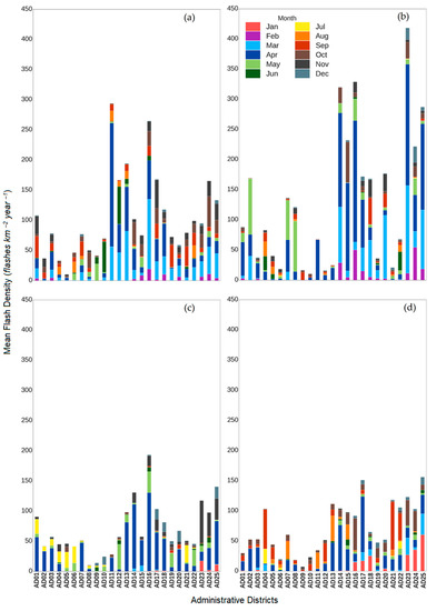 (a–d) represent the district-wise monthly variation of lightning flash densities from 2018 to 2021, respectively.