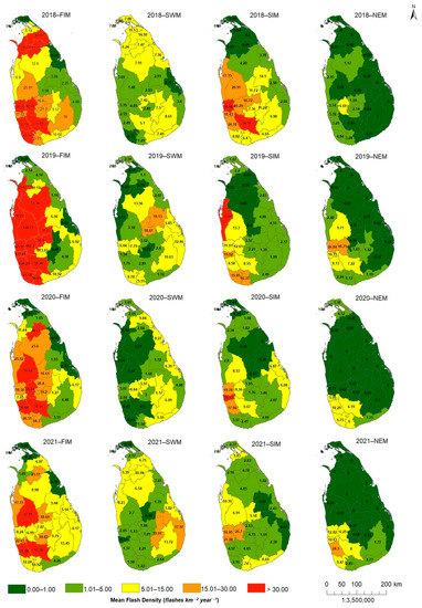 Initially, datasets from 2018 to 2021 were used to generate district-level and island-level lightning density on an annual, seasonal, and monthly basis. Based on the data, the number of flashes across the whole island changes every year; 2019 was found to have the highest peak, while 2020 had the lowest. According to 2019’s annual data broken down by district, the highest flash density was observed in the Colombo district. Additionally, districts on the west and northwest sides of the island showed distinct margins for high flash densities in 2018 and 2019, whereas no such margins emerged in 2020 or 2021. According to the monthly variation, April depicted the highest value from 2018 to 2021 annually. The monthly data from March to May and from August to November depicted the features of two distinct humps, and February to June represented the highest hump. District-wise monthly variation indicated that most of the districts were stroked by lightning in April 2019. The results showed that April was the month with the highest number of lightning strikes across the districts and the numbers had slightly decreased in 2020 and 2021. FIM season depicted a significant amount of flash density compared to the other seasons when considering the whole country, and its peak was reached in 2019. Even though FIM demonstrated more flashes on the northern side of Sri Lanka in 2019, most of the districts in the wet zone and intermediate zone were impacted in 2018, 2020, and 2021. The other significant season was SIM, where district-wise, the impact took place around the wet zone, and it was found to be significantly lower compared to the FIM.