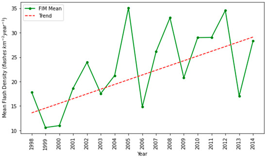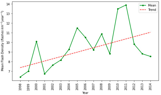 Average flash density from 1998 to 2014 varied between 6.00–14.00 flashes km−2 year−1 as shown in Table 1.