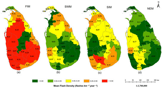 Identifying trends in lightning during FIM, SWM, SIM, and NEM considering administrative districts will reduce the risk of lightning strikes during farming and construction. In order to identify existing seasonal trends in the administrative districts in Sri Lanka, the Mann-Kendall test and Sen’s slope estimator were performed on seasonal data from 1998 to 2014. Sen’s slopes obtained for each district are displayed using colour gradients and tau values are displayed as numbers, as shown in Figure 15. The highest and second-highest positive trends during FIM are shown in Kalutara and Galle districts with slope values of 3.27 and 1.7, respectively, whereas negative trends are observed in Kandy, Matale, and Polonnaruwa districts. During SWM, Vavuniya and Mullaitivu show positive trend values of 0.45 and 0.37, respectively. Districts such as Ampara, Badulla, and Moneragala display the highest negative trends during SWM. Ratnapura district shows the highest trend of 0.61 during SIM, whereas the highest negative trend is displayed by Gampaha, with a −0.54 trend value. Apart from Gampaha, which displays a positive trend of 0.32, and Galle, with a −0.58 trend, all other districts display their lowest trend values during NEM. By obtaining statistical parameters using the Mann-Kendall test for NEM, it can be concluded that no district shows a statistically significant trend in lightning.