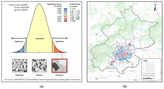 Results of spatial autocorrelation analysis: (a) Results of Moran’s 1 spatial autocorrelation analysis; (b) LISA analysis results.