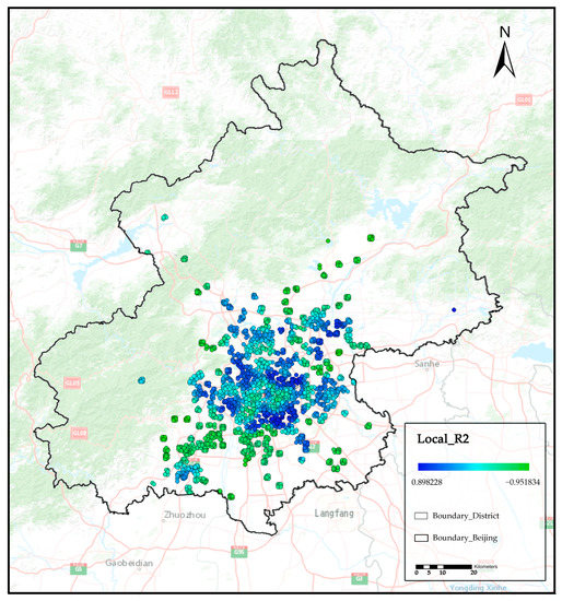 The results of the MGWR model allowed us to examine the relationship between COVID-19 risk and the selected characteristics, as well as the spatial variation in the influence of each feature. As can be seen in Figure 6, the fit of each statistical unit varied considerably, showing a gradual decrease from the middle to the surrounding area in general. It can be seen that a poorly fitted ring occurred in the central Beijing area. This indicates that the explanatory power of the selected features in this region is highly differentiated in space.