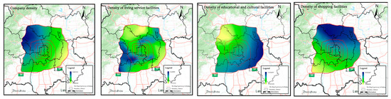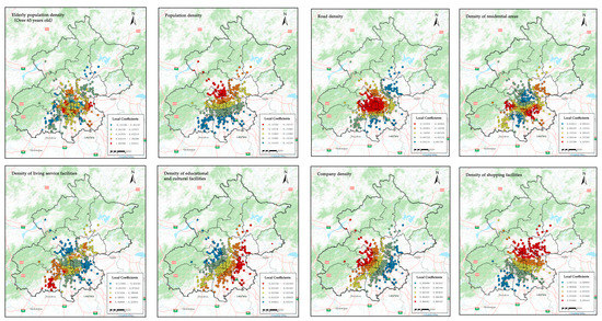 The statistical results of each characteristic coefficient of the MGWR model are shown in Table 3. Elderly population density, shopping service facilities, corporate enterprises, residential areas, and living service facilities showed a positive influence on COVID-19 risk. Road density, total population density, and density of scientific, educational, and cultural facilities showed a negative effect on COVID-19 risk. The indicator of standard deviation reflects the dispersion degree of each characteristic on the likelihood of COVID-19 occurrence; a larger standard deviation represents a more significant difference in the degree of influence in different neighborhoods. The densities of population, shopping service facilities, corporate enterprises, and scientific, educational, and cultural service facilities showed global influence. In contrast, the effect of the remaining four characteristics on COVID-19 risk showed evident spatial heterogeneity.
