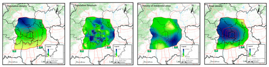 As the number of MGWR operational results was 2497 statistical samples of different impact factors, not all regions were included. In order to comprehensively assign spatial heterogeneity weights to the different COVID-19 risk impact factors for each statistical cell, the results of the MGWR model were estimated globally (within the Sixth Ring Road of Beijing) using kriging interpolation (Equation (1)) (Figure 9). The following analysis was derived by combining the prediction results of COVID-19 risk and the global estimation results of each influencing factor: