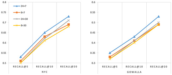 In the previous experiment, time embedding was performed every hour of every week. To examine the impact of time embedding scales, we evaluated time embedding every three hours of every week, every three hours of every month, and every one hour of every month. The experimental results are shown in Figure 5, where 8 and 24 represent the calculation times of every day, and 7 and 30 represent the embedding cycle. The Rec@5 values of the 24 × 7, 8 × 7, 24 × 30, and 8 × 30 on the NYC dataset were 0.53, 0.51, 0.50, and 0.50, respectively. Three-hour intervals are more difficult to predict, and therefore the results of hour intervals are embedded better than those of three-hour intervals. Since most people have relatively regular movement patterns in terms of sequential cycles, the results of experiments on a monthly scale are not as good as those on a weekly scale.