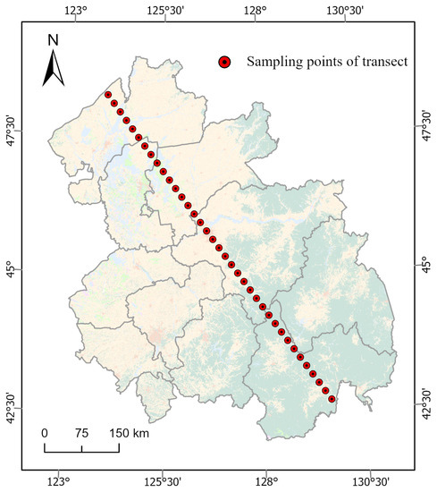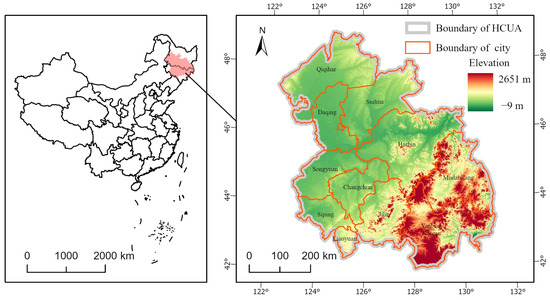 The Harbin–Changchun urban agglomeration (HCUA) is located in Northeast China, mainly including the central and southern parts of Heilongjiang Province and the central part of Jilin Province, including 11 prefecture-level cities, of which Harbin and Changchun are provincial capitals, with a total area of approximately 263,600 km2. The terrain of the study area is high in the southeast and low in the northwest, and generally tilts from south to north (Figure 1).