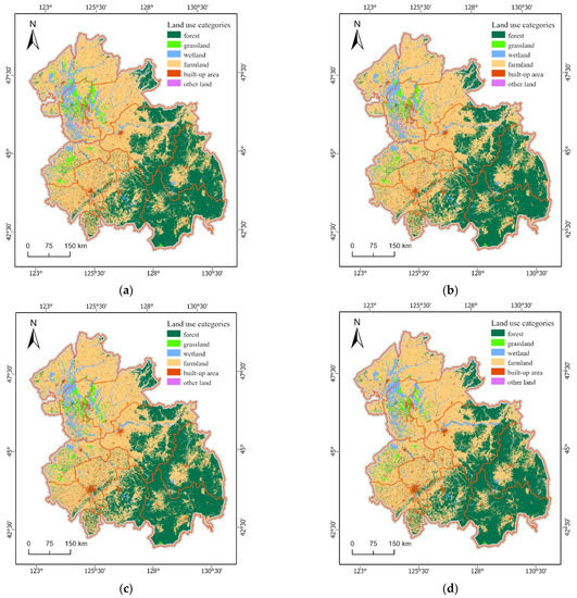 Land use maps in different years: (a) 1990; (b) 2000; (c) 2010; (d) 2020.