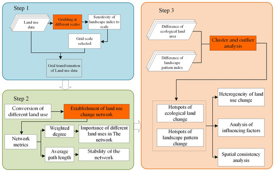 A research framework for the land use change and hotspot analysis in the HCUA was proposed. The main work can be divided into three steps. The first step was the grid processing of land use data, in which the reasonable data grid scale was determined through the sensitivity of landscape index changes in transects at different scales. Then, the transformation characteristics of different land use types were analyzed. The key land use type in the land use transformation network was determined by using the complex network analysis method, and the stability and changes of the network were analyzed. Finally, the cluster and outlier analysis method was used to analyze the hotspots of ecological land and landscape pattern changes; the spatial consistency, the spatial heterogeneity, and the influencing factors were also analyzed (Figure 3).