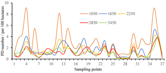 The sensitivity of the landscape pattern index to the scale was measured by the PD change of the sampling points under different analysis scales. When the analysis scale was 2850 m, the PD change curve was gentle, so 2850 m was selected as the scale of the landscape pattern analysis in this study (Figure 5).