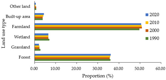 Farmland accounted for the largest proportion of land use types in HCUA, accounting for more than 49% in each year, followed by forest land and wetland. The total proportion of ecological land was 44%, and the ecological condition of this location was superior. According to the interannual changes, the proportion of built-up areas increased annually, from 3.78% to 4.35%, indicating an increase of 15.08%. The proportion of farmland areas first increased and then decreased. The proportion of forest land areas decreased first and then increased. The proportion of grassland areas decreased annually. The wetland areas decreased significantly from 1990 to 2000, and the proportion in 2020 increased compared with that in 2010 but did not recover to the proportion in 1990 (Figure 6).