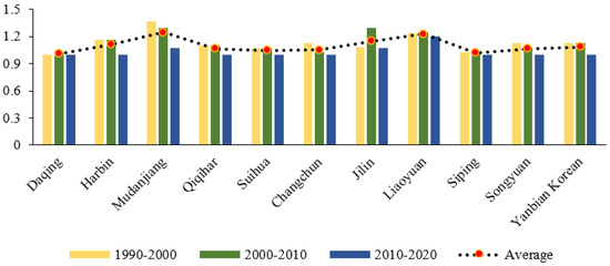 The land use change in each city from 1990 to 2000 mainly manifested as the loss of ecological land (Figure A1). Except for Changchun City, the maximum value of the output degree in the cities was from forest land, grassland, or wetland areas, and the maximum input degree in each city was from farmland areas. From 2000 to 2010, the land use change in each city was mainly realized as the restoration of ecological land. Among the cities, Harbin and Siping had the largest input degrees of forest land, Daqing and Suihua had the largest input degrees of grassland, Mudanjiang and Qiqihar had the largest input degrees of wetland, and five cities had the largest output degrees of farmland.