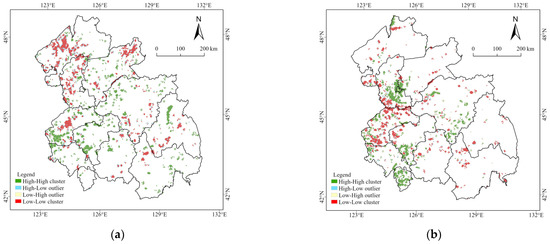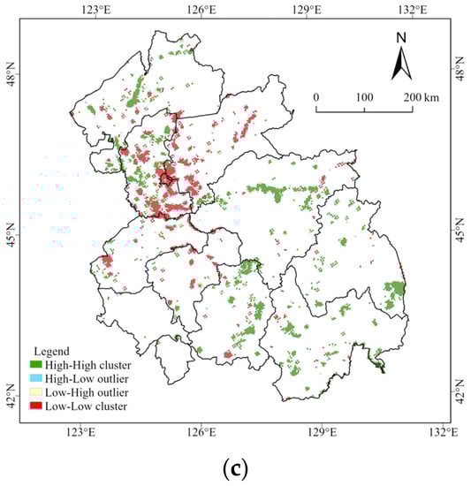 In the high–high cluster area, namely the hotspot of increasing ecological land use, the distributions were obviously different in diverse periods. The distribution of this type of region was relatively scattered from 1990 to 2000. From 2000 to 2010, the region was mainly distributed in the west of the study area and was widely distributed in Daqing City, Changchun, and Liaoyuan. From 2010 to 2020, the change in ecological land use was manifested as low–low clustering regions; that is, the hotspots of increasing ecological land use area were mainly distributed in the southwest of Daqing.