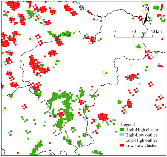 The global Moran’s I index is a commonly used indicator and is often used to evaluate whether the global spatial pattern of elements is clustered [48,49,50]. The statistical significance of the index is determined by the z value and its corresponding p-value. However, the global Moran’s I index does not describe the spatial clustering position of high or low values [29]. The local Moran’s I, also known as the cluster and outlier analysis method, detects the hotspot distribution of local spatial elements by comparing the relationship between observed and adjacent values and the global situation [27].