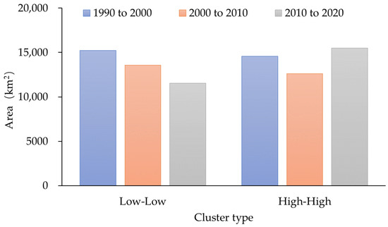 In 1995–2000 and 2010–2020, the high–high clustering type surrounded the urban built-up areas (Figure 9). This finding indicated that the impact of urban development on the ecological environment is not always negative. Human activities have positively affected the environment with the economic development and the improvement of environmental awareness [51]. The typical areas included the Changchun built-up areas.