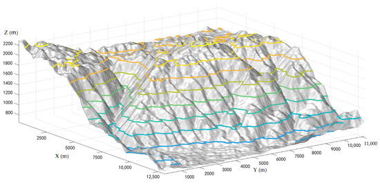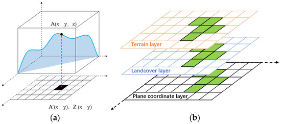 As shown in Figure 1a, grid coordinate mapping was carried out on the above original data to realize the establishment of the experimental environment model [41]. This method has the advantages of simple data structure, convenient spatial analysis, and combination of multi-level spatial data. The processed map is still a traditional single-layer map, and its access and reading are in single-interface mode. For this study, the simple data structure was improved by referring to the literature [42]. A multi-layer feature map was constructed to store landcover information and 3D coordinate information (Figure 1b), which could retain environmental feature information effectively and improve the maintainability of the cost map. The resulting landcover distribution and terrain information are shown in Figure 2 and Figure 3, respectively.