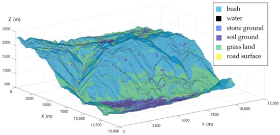 Firstly, six landcover types of water, bush, grass land, soil ground, stone ground, and road surface were obtained from remote sensing images through a supervised classification method [40]. Then, the two kinds of data were spatially connected to obtain the original data including 3D coordinates and landcover information.