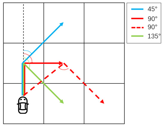 In the path planning in this study, eight-node expansion was adopted in the improved A* algorithm, with the eight nodes around each node comprising alternatives for the extending node. The path width was set as a constant, and whether the vehicle (medium or large) can pass a bend of the current width should be considered when selecting the extending node. The radii of the inner and outer rings of the vehicle and the radii of the inner and outer rings of the path are important parameters to judge whether a bend can be passed (Table 3). When the path radii (inner and outer) are larger than the vehicle radii (inner and outer), the node is regarded as passable.