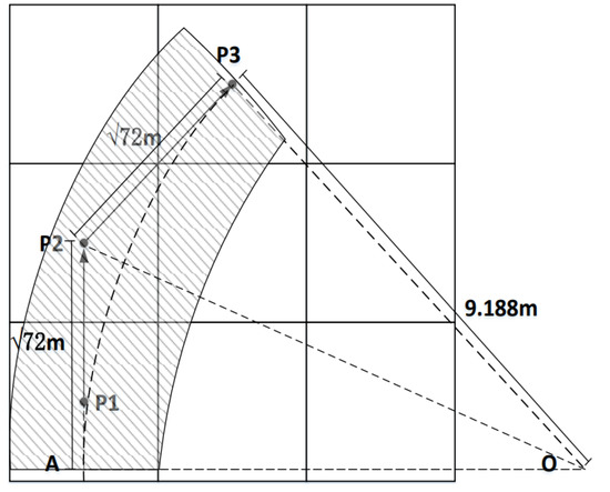 As shown in Figure 8, the path is parent node(P1) → current node(P2) → child node(P3), and the vehicle turns 135°. The lengths of the connections P1P2 and P2P3 are different, and the turning angle is large. The analysis shows that the turning radius should be controlled by the short line. Therefore, AP2 with the same length as P1P2 is taken on the line P2P3, and points A and P1 are taken as the respective perpendiculars of the two lines. The two perpendiculars intersect at point O, and point O is taken as the center of the circle; OP1 is then taken as the radius of the circle. It is clear that ∠P2P3P1 = 45° and OA⊥AP3, so OP3 = AP3 = √72−6; thus, OP1 = 12−, about 3.51 m. The circle is extended outside by 4.5 m as the and inside by 1.5 m as the .