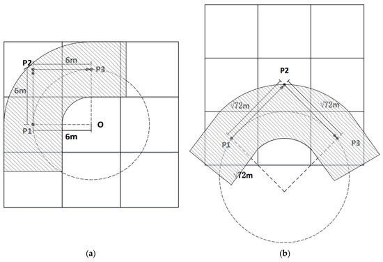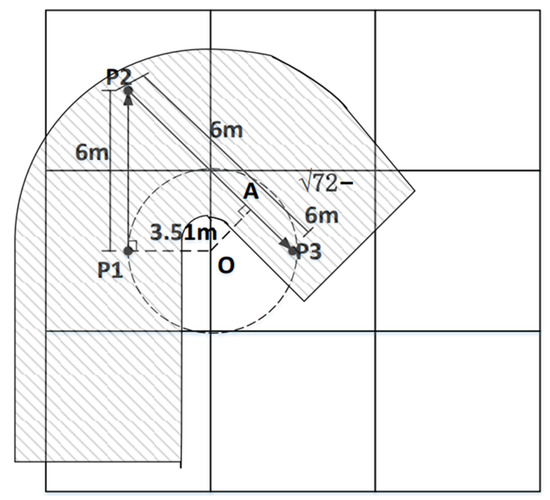 As shown in Figure 7a, the path is parent node(P1) → current node(P2) → child node(P3), and the vehicle turns 90°. In order to calculate the internal and external radii of the path in this case, P1P2 and P2P3 are crossed, and P1 and P3 are taken as the respective perpendiculars. The two perpendiculars intersect at point O, and point O is taken as the center of the circle. OP1 is taken as the radius of the circle. It is clear that the radius of the circle is the same length as the grid edge (6 m), and the circle is extended to the inside and outside by 3 m to form the internal radius and the external radius.